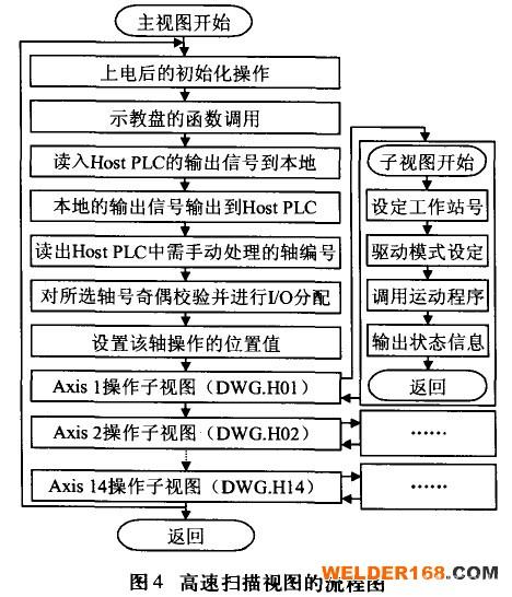 伺服系統控制程序采用模塊化編程,各自針對要求不同的應用設計了高速掃描視圖、低速掃描視圖和運動控制程序。系統上電之后,CPU就同時開始高速掃描與低速掃描兩個獨立的掃描過程,并在高速掃描過程中調用運動程序來進行運動控制。低速和高速掃描視圖的流程分別如圖3和圖4所示。